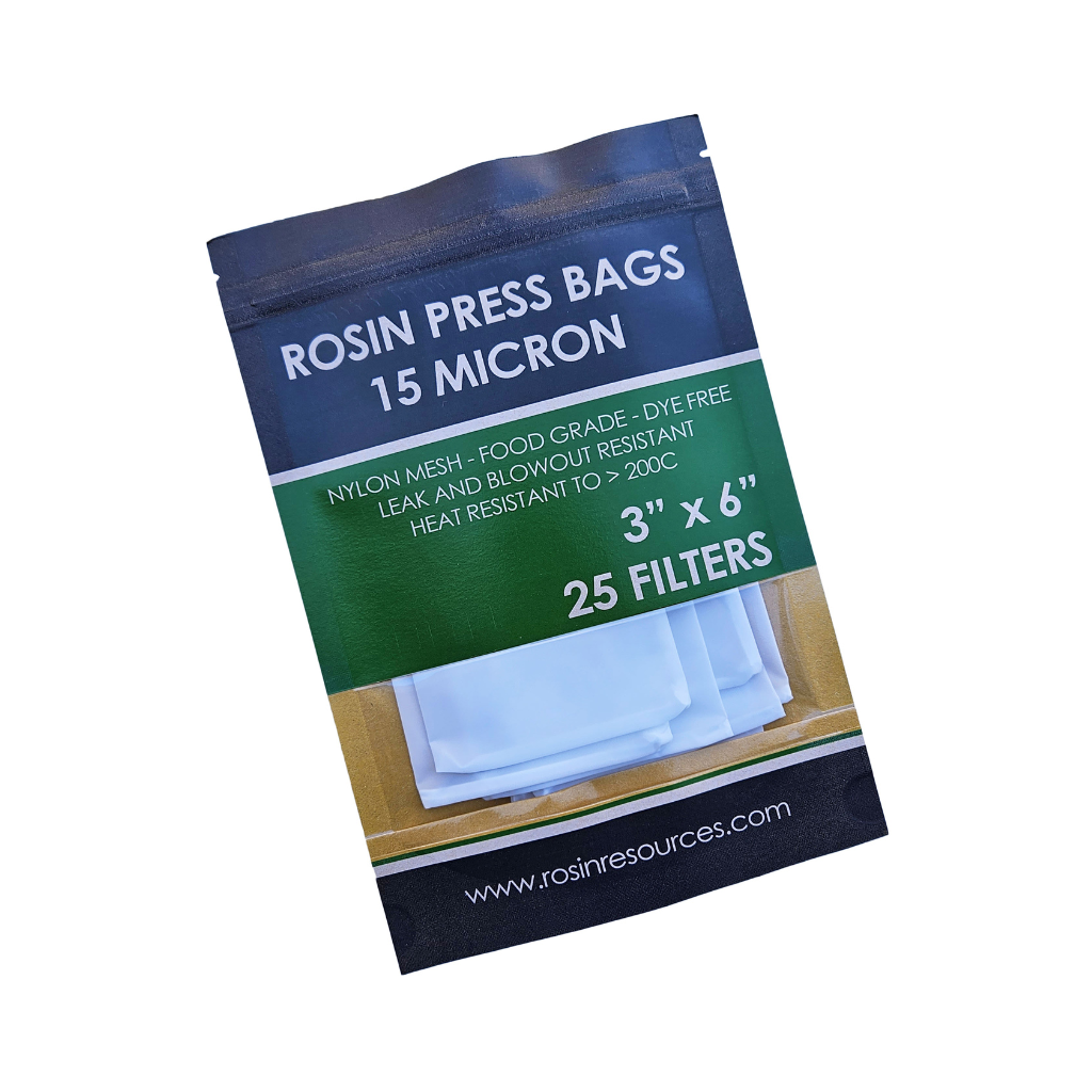 Our 15 micron press bags are specifically designed to withstand heat and pressure while providing unparalleled filtration performance when pressing bubble hash or flower. We use only high grade 100% nylon mesh, double-stitched with folded seams to reduce risk of blow-outs and engineered to contain fine particulate and reduce contamination in rosin. Heat safe up to 430ºF/225ºC and at pressures up to 1500PSI, although best performance for most input material will be at temperatures from 150-220F and pressures below 750 platen PSI for high quality input material.Â